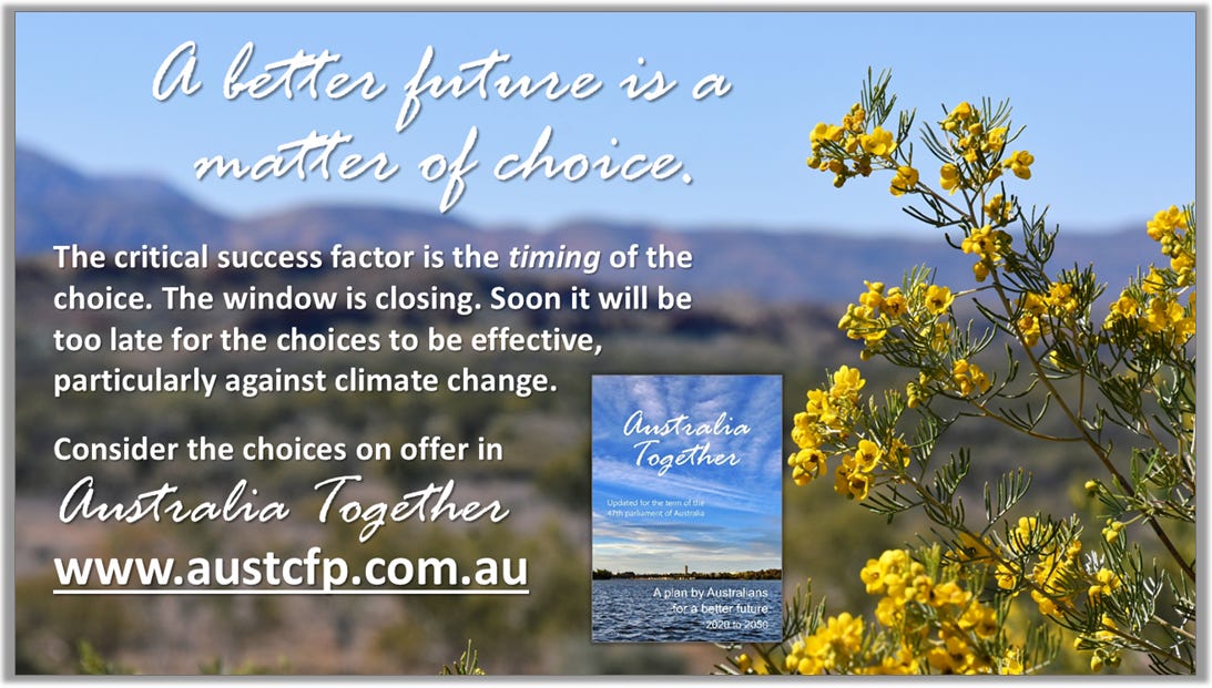 Most, if not all, of our options as an Australian community for securing a better future are a matter of choice. There is nothing to prevent us from freely choosing these options and it is not too late to invoke them. Nothing about either our present standard of living or our prospects as a nation for a better future need be sacrificed if Australians act together to make the better future they have repeatedly said they want a reality. The critical success factor is the timing of the choice. The window is closing. Soon it will be too late for the choices to be effective, particularly against climate change.